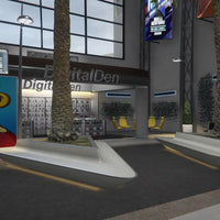 Detailed areas: DigitalDen-style electronics store, duty-free, café zones, seating and waiting areas